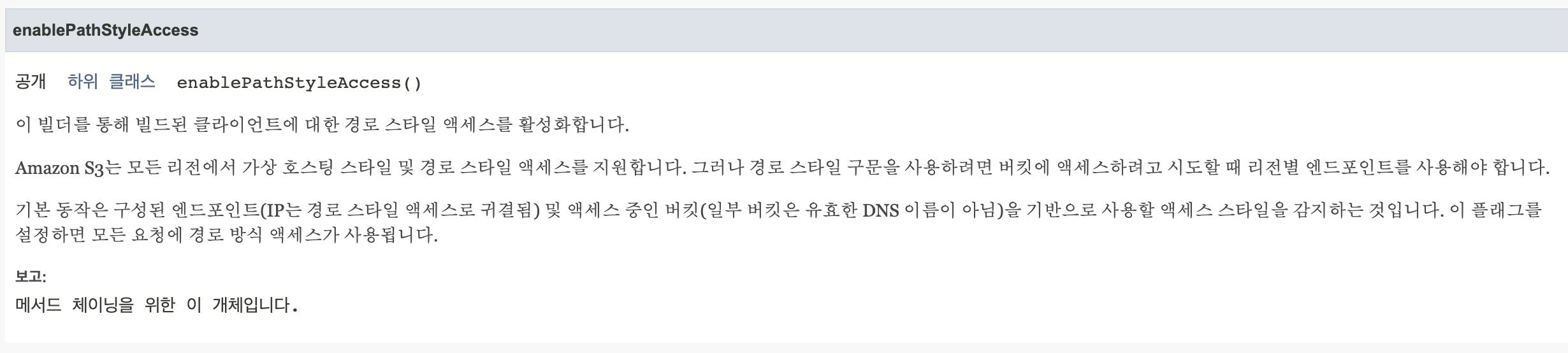이 경우 s3클라이언트 생성자 부분에 enablePathStyleAccess 를 넣어 해결할 수 있다.