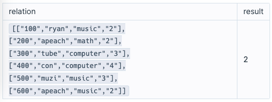 - relation의 로우(row)의 길이는 1 이상 20 이하이며, 각각의 로우는 릴레이션의 튜플을 나타낸다.