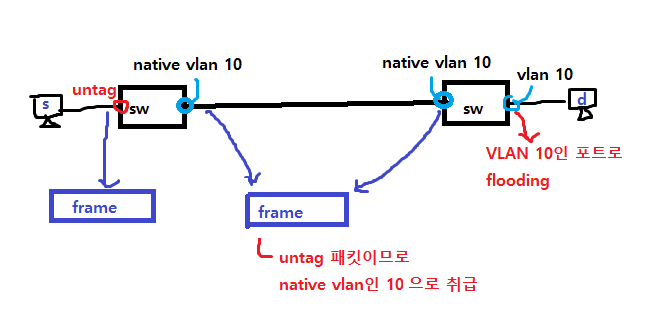 untag 패킷을 받으면 vlan 10으로 취급하기 때문에 목적지 d PC까지 무사히 도착하게 됩니다. 이처럼 Native VLAN을 사용하면 Tag를 encap/decap하는 과정이 없기 때문에 데이터가 비교적 빠르게 전달됩니다.