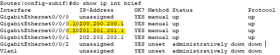 router(config-subif)# ip address [default gateway ip] [subnetmask]
